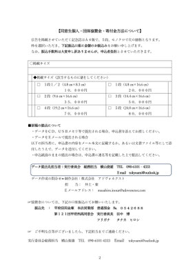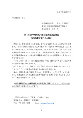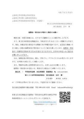来年(令和8年)5月16日(土)に甲府記念日ホテルにて開催する第121回定期総会の協賛金(広告協賛・個人協賛・寄付金)の募集が始まりました。今回の総会資料は B5 版から A4 版に変更しサイズを大きくいたしま すが、同窓会理事会の承認を得て、物価高騰により広告欄の各区画単価を引き上げさせていただきましたので、ご理解とご協力をよろしくお願いいたします。協賛金申し込みの資料&詳細はここから専用ページに移動ください。